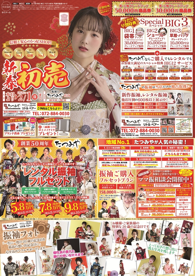 門真市・寝屋川市・守口市・大東市・四條畷市・枚方市・交野市・大阪市鶴見区で取り扱っているのは『たつみや』だけ。同地区同柄成約はしませんので成人式でかぶりません。